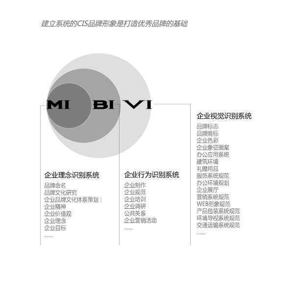 力的形象載體。完整的企業(yè)CIS由理念識別(Mind Identity 簡稱MI)、行為識別(Behariour Identity 簡稱 BI)